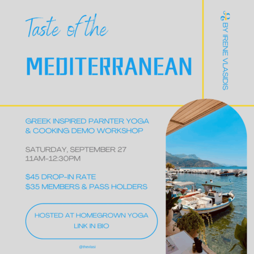 After a Greek inspired all levels Partner Yoga, Irene will highlight the benefits of the Mediterranean diet and offer a cooking demonstration to gain insights in preparing healthy, balanced meals that influences positive dietary habits and cooking practices. You will leave inspired and educated about holistic health and well-being.